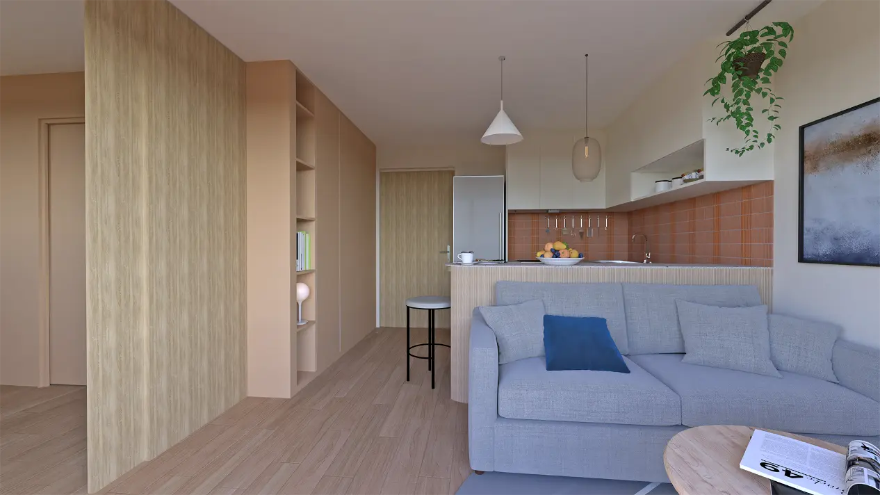 Appartement élégant et lumineux de Type 2 situé au premier étage comprenant un séjour modulable au choix : un séjour spacieux ou espace bureau, 1 chambre, une salle d'eau avec wc et un balcon.