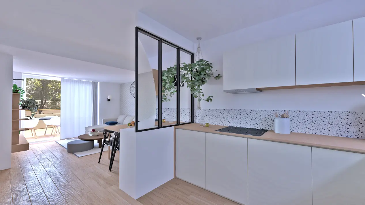 Appartement confortable et élégant de Type 3 situé au premier étage comprenant un séjour lumineux, 2 chambres, deux salles d'eau et une terrasse spacieuse.